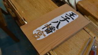 神具神額の文字彫刻 神額の板に文字の大きさを調整し、板に貼りました。 彫刻刀をしっかりと研いで、彫刻を始めました。 前回は桧で柔らかいので彫りやすかったですが、欅は硬いので彫るのが大変です。 明日もきっといい日です。 しん 組み込み式御霊舎の製作...2026.04.16神具御霊舎