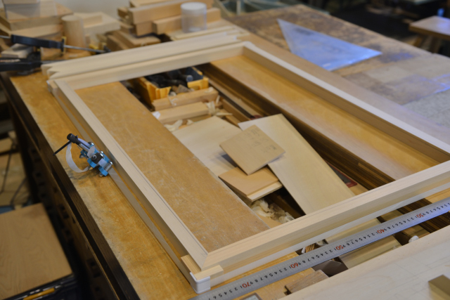 外枠を留めで合わせてこれに合わせて格子の胴付きを加工します。