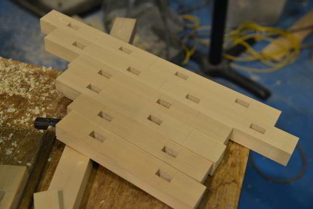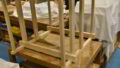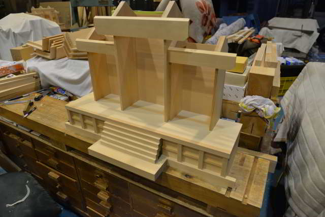 組立式三段案の祓い串を作り、完成したので、仮組をばらして、水で拭いておきました。