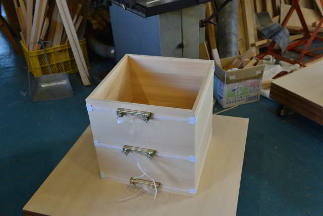側板の留めを切り、長さを決め、仮組をしました。