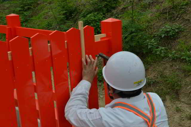 2日目は込み栓打ちと控え柱の取り付け、埋戻し、垣板の取り付け、お社の設置を行いました。