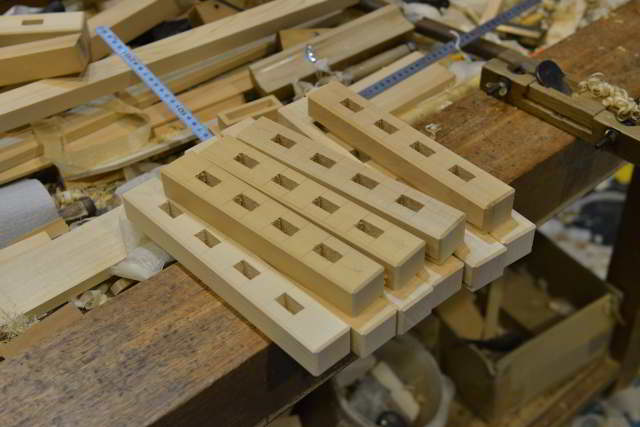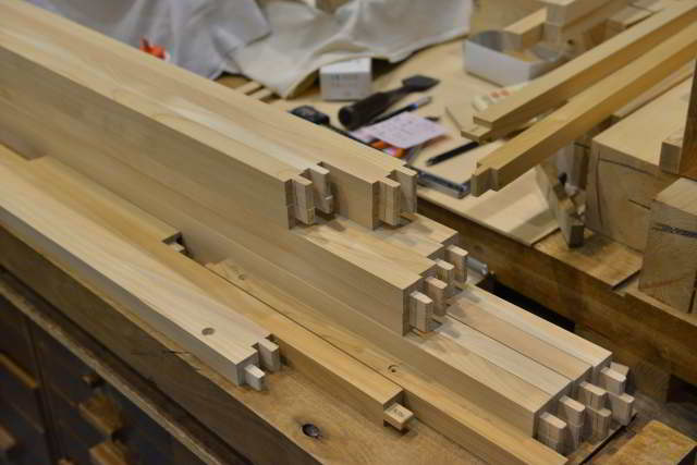 組立式三段案の脚の柱を仕上げて、ホゾを付け、胴付きを決めました。