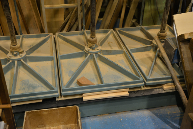 霊舎台の格狭間板の裏板を仕上げたので、切り抜いた板を張り合わせました。
