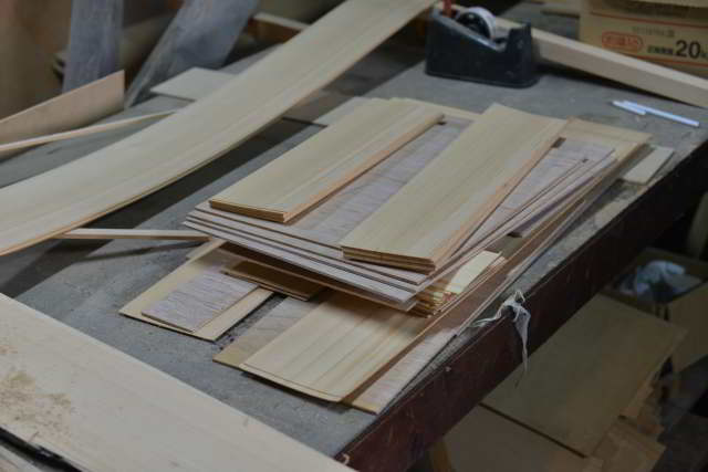 こちらの木曾桧の突き板を合板の上で接ぎ合わせて圧着します