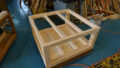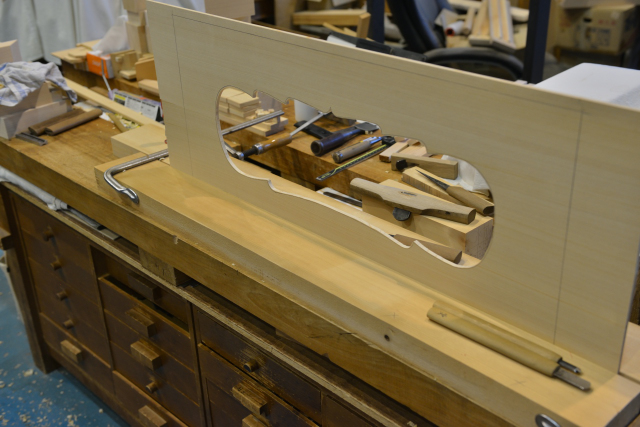 格狭間板を木で挟み、立ててから墨を消すように南京鉋と小刀で削っています。