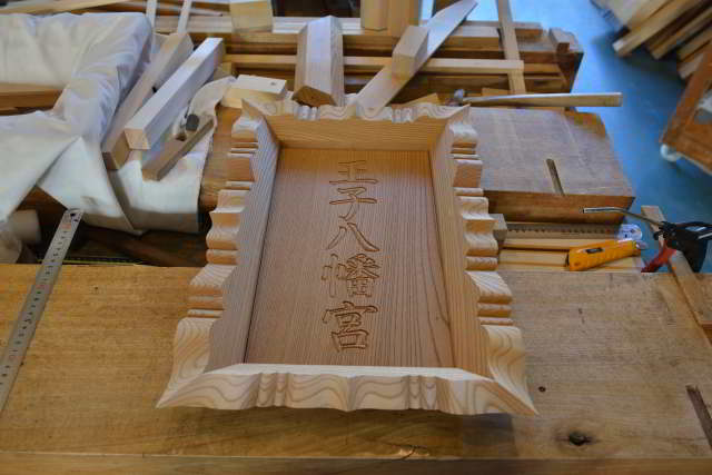 神額の枠の縁を鑿で整えました。