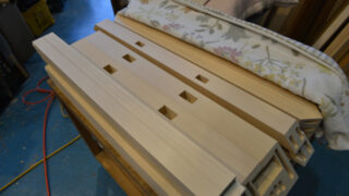 神棚霊舎台の製作 霊舎台の根太の大きさを決め、仕上げをしてから長さを決めて、ホゾを付け、胴付きを決めました。 次は上下の行框にホゾ穴の墨をして、角鑿で穴を空け、鑿で掃除をしました。 サネを作り、面取りをしたので、次は仮組をします。 明日もきっといい...2025.12.18神棚神具御霊舎