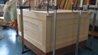 神具霊舎台の本組 霊舎台を1つ組み立てをしました。 直角などを見ながらクランプで固定しました。 次はL字台の製作を始め、大きさを決め、長めに切りました。 明日もきっといい日です。 しん 唐櫃の製作を進めていきます。 箱の方も仕上げが出来ました...2026.01.27神具御霊舎