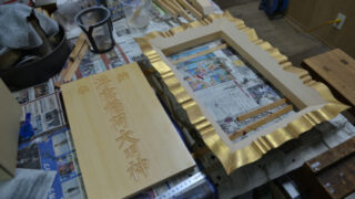 神具神額の文字彫刻 神額の文字彫刻の続きをしました。 綺麗に彫り終わり、裏に取り付ける留め木の木取加工をしました。 次は部品をすべてペーパー掛けをして、文字板はクリア塗装をしました。 今は枠の縁に金色を乗せています。 明日もきっといい日です。 しん...2026.03.26神具御霊舎