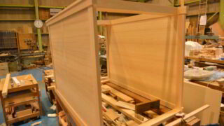 神具組み込み式御霊舎の製作 組み込み式御霊舎の製作を進めていきます こちらは箱組前の仮組状態の御霊舎です。 奥行が950㎜と通常ではありえない位大きいので組み立てる場所とハタガネの準備が大変です。 900㎜×900㎜の御霊舎用の台車では少し乗らないので棒を固...2026.04.09神具御霊舎