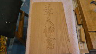 神具神額の文字彫刻 神額の板に文字の大きさを調整し、板に貼りました。 彫刻刀をしっかりと研いで、彫刻を始めました。 前回は桧で柔らかいので彫りやすかったですが、欅は硬いので彫るのが大変です。 明日もきっといい日です。 しん 組み込み式御霊舎の製作...2026.04.16神具御霊舎