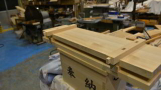 神具組立式三段案の製作 組立式三段案の組み立てた脚のねじの調整をしました。 次は天板の面取りをして、左右のズレ止めを取り付けています。 その後、振れ止めを作ります。 明日もきっといい日です。 しん 賽銭箱の製作を進めていきます。 文字彫刻の際は色々...2025.11.20神具