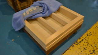 御霊舎霊舎台の加工 霊舎台の格狭間板のプレスを外して、しっかりと付いているかを確認しました。 次は霊舎台の天板の厚みを削り、上枠を仮組をして、留めの長さを図ってから巾を落とし、隙間がないかを確認しました。 その後は棚板を取り付けに行く準備をしました。 ...2025.12.26御霊舎神具